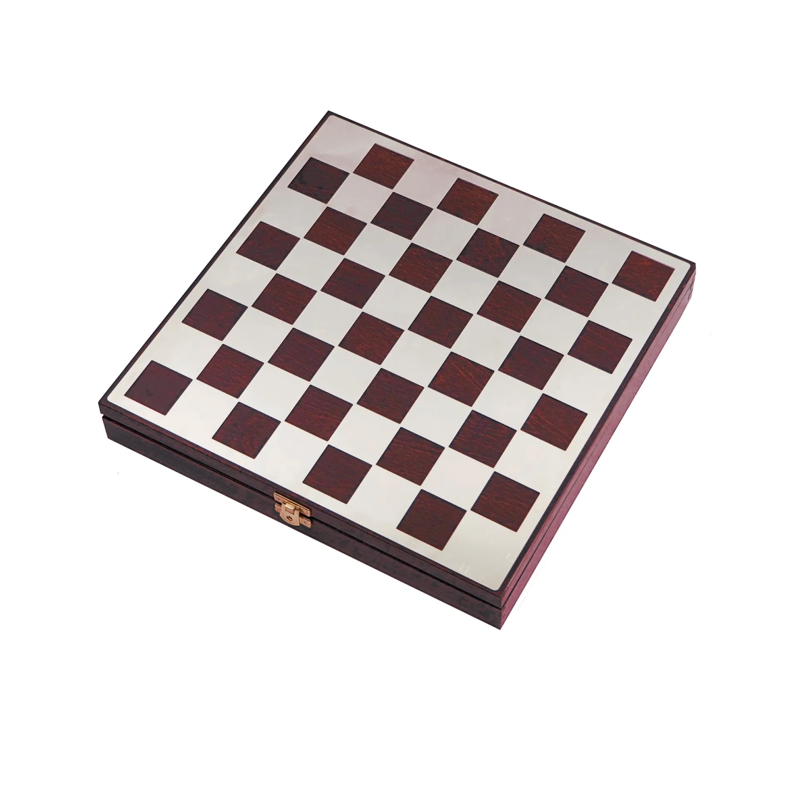 Drewniane, eleganckie pudełko ze stalową szachownicą dopełnia stylowego wyglądu całości.